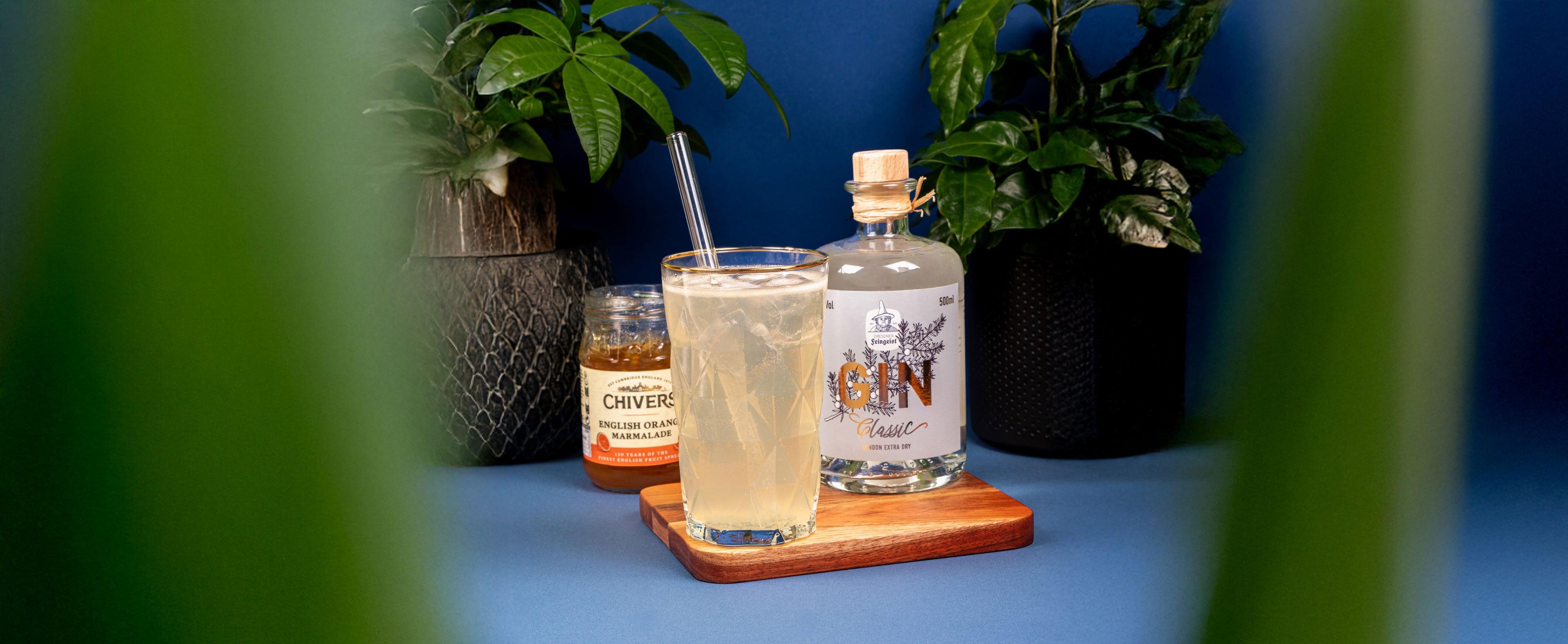 - Gin, Cointreau, Zitronensaft und Orangenmarmelade in den Shaker geben.